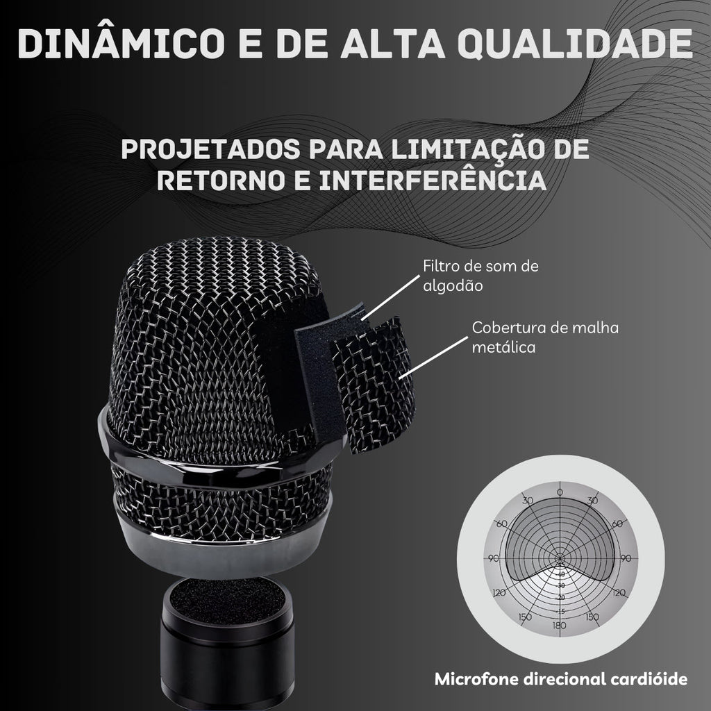 - Dois microfones de mão dinâmicos: Uso simultâneo sem interferências, ideal para duetos e apresentações em dupla