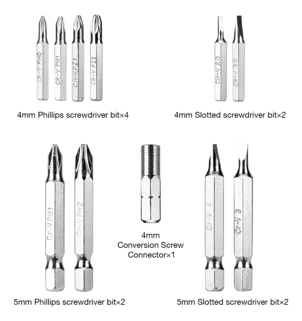- Pontas inclusas: Kit com 12, 24 ou até 68 bits magnéticos (Philips, fenda, Torx, pentalobe, triângulo, hex, entre outros)